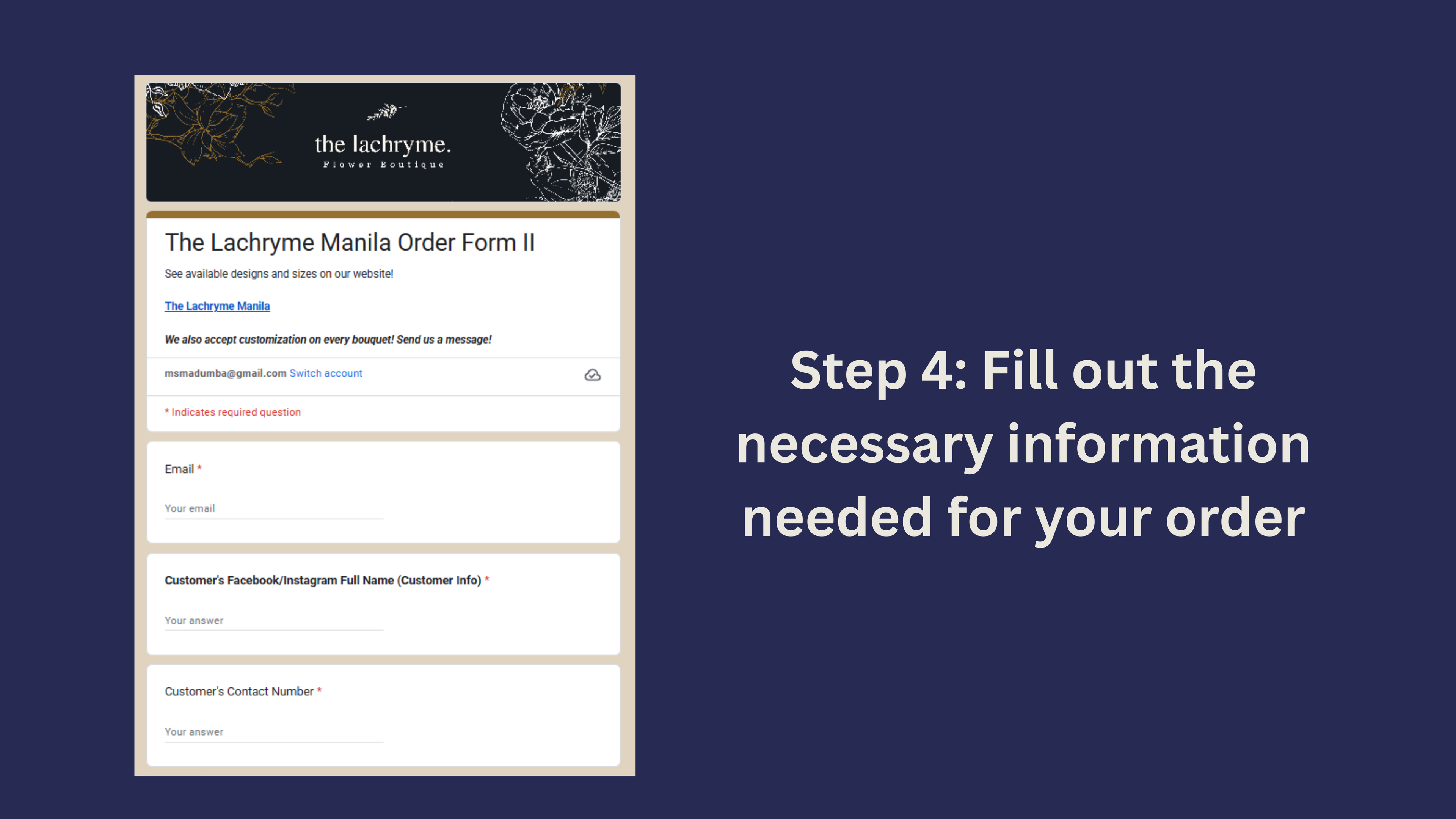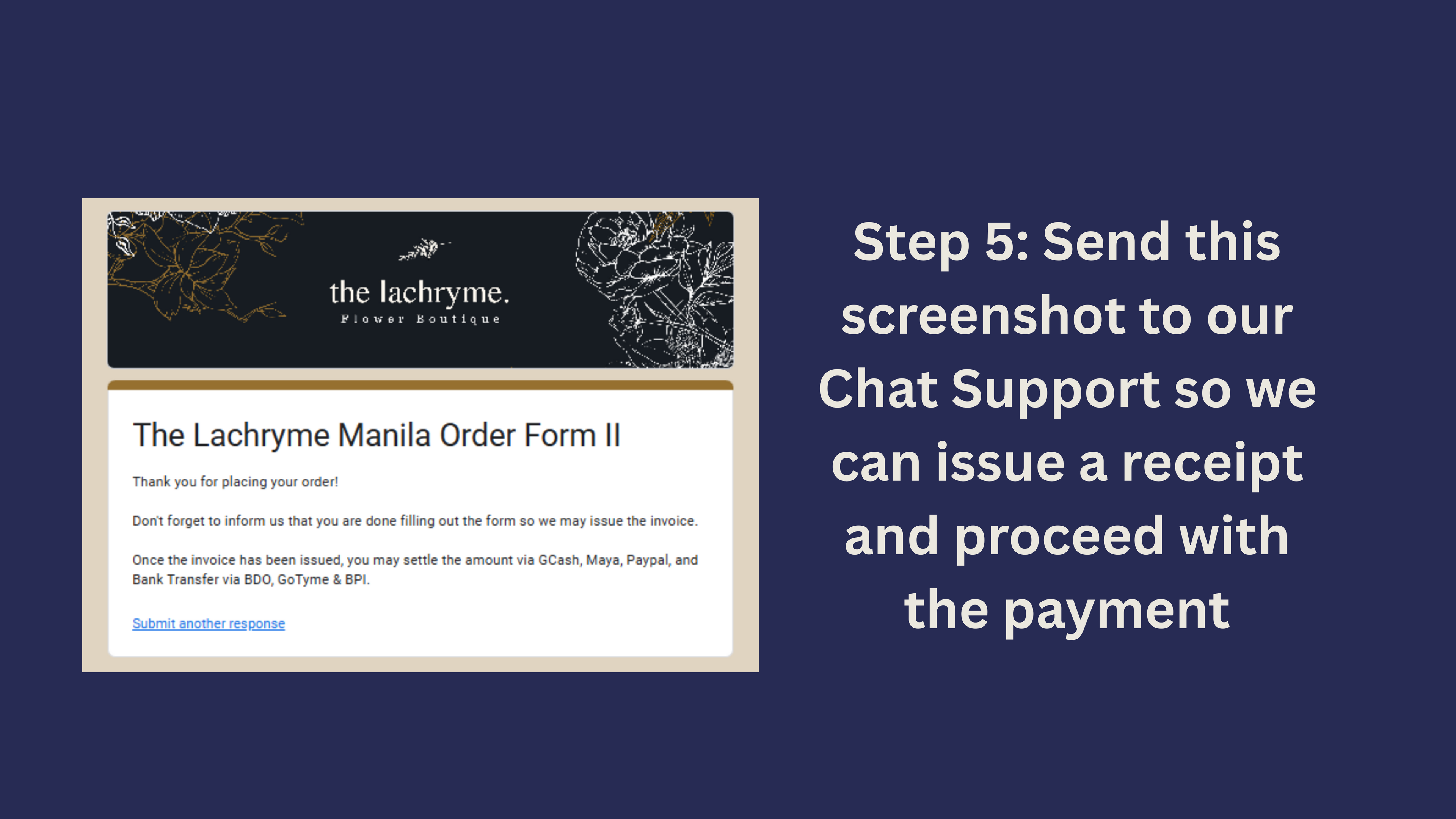 After approval, we’ll provide the next step instructions via our Social Media Channels or Email (florist.thelachrymemanila@gmail.com)
