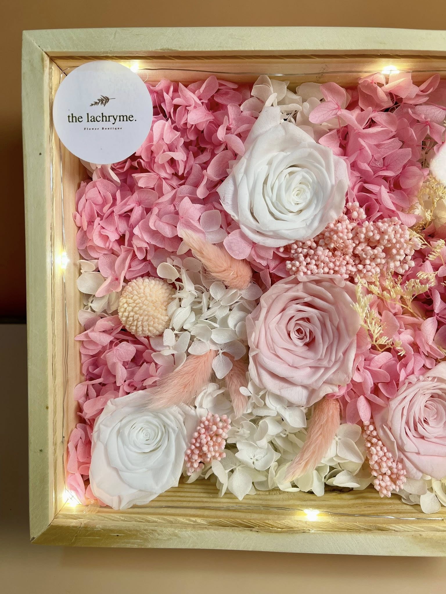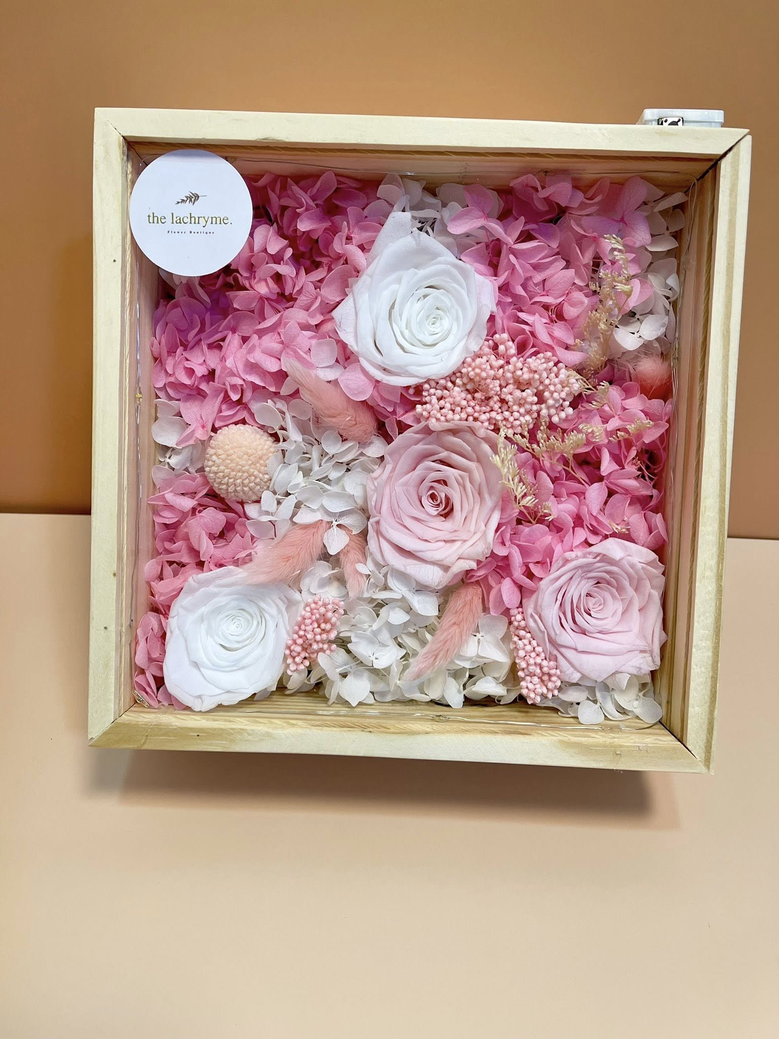 A tribute to eternal elegance. Housed within a luxurious Shadow Box, this artful composition of Eternal Preserved Roses, soft Hydrangeas, and curated dried botanicals whispers of timeless romance and delicate grandeur—an heirloom of emotion, sealed in bloom.
