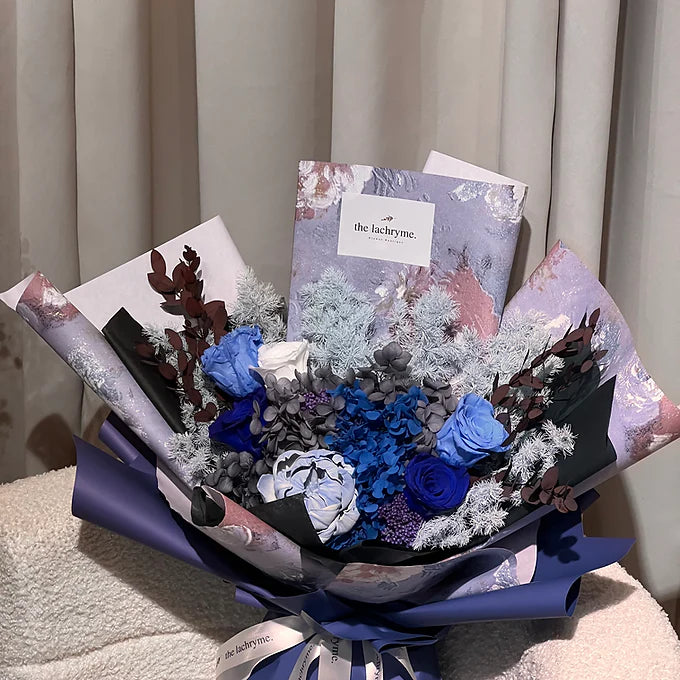 Gabe Deluxe is a striking arrangement that blends soft light blue with deep, moody navy tones — creating a perfect balance of elegance and strength. Wrapped in uniquely patterned floral sheets, this bouquet carries both edge and refinement, making it a standout gift for those who embrace their individuality.