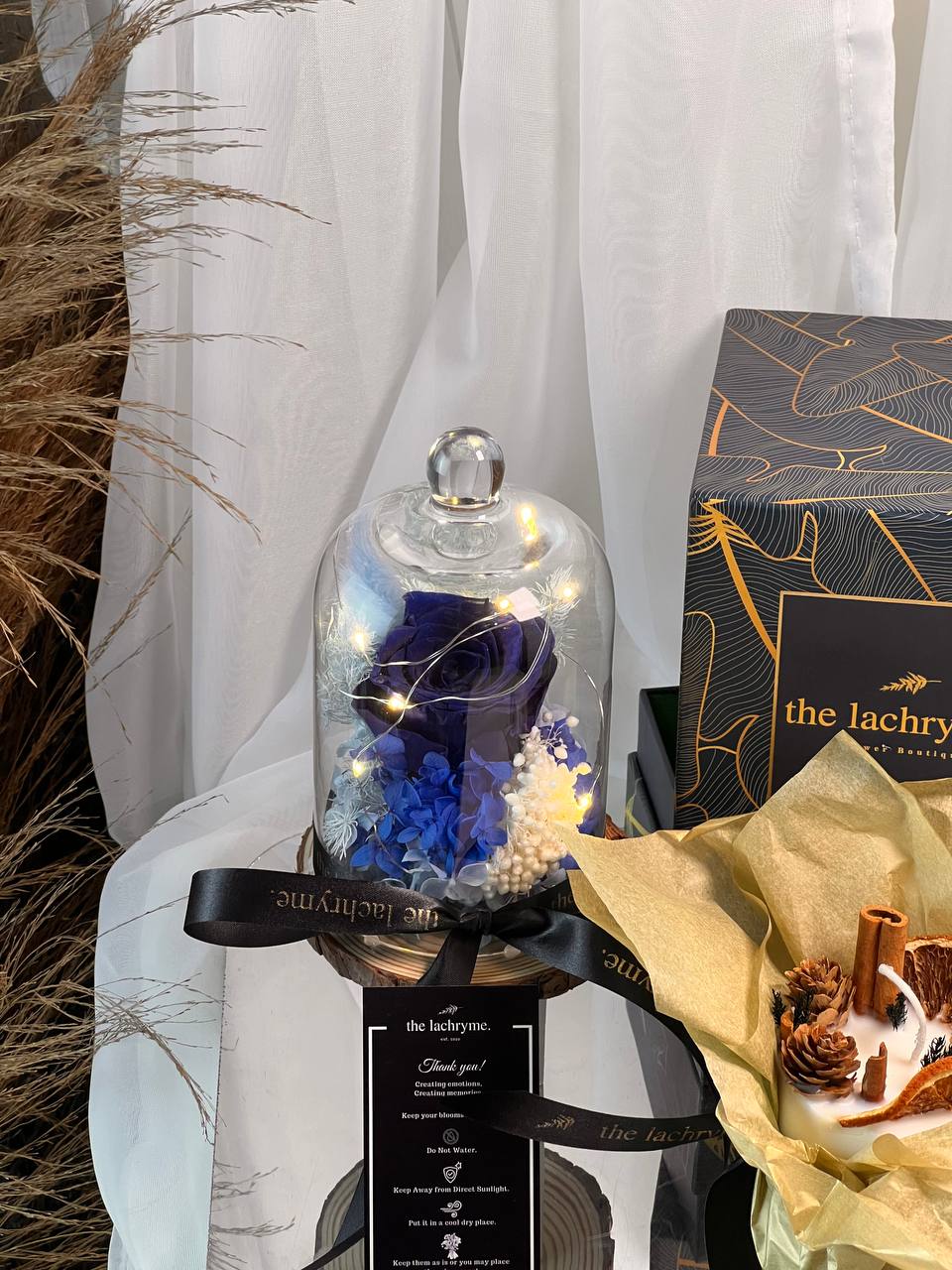 An exquisite arrangement inside a Dome composed of an Eternal Preserved Rose, Hydrangeas, Bunny Tail, Retro, and other dried flowers.