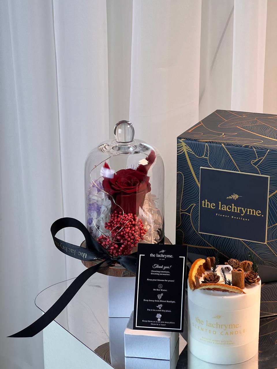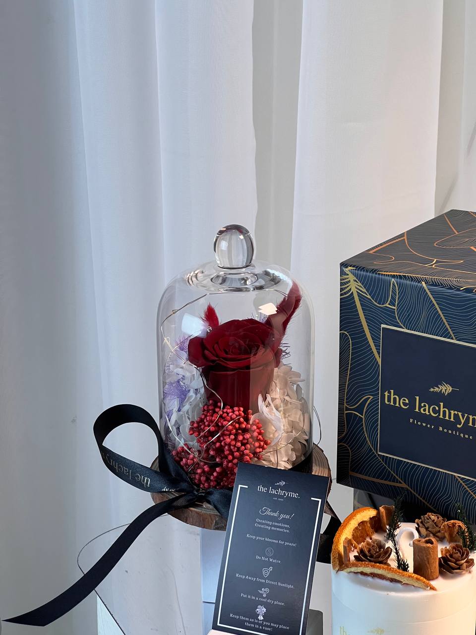 An exquisite arrangement inside a Dome composed of an Eternal Preserved Rose, Hydrangeas, Bunny Tail, Retro, and other dried flowers.