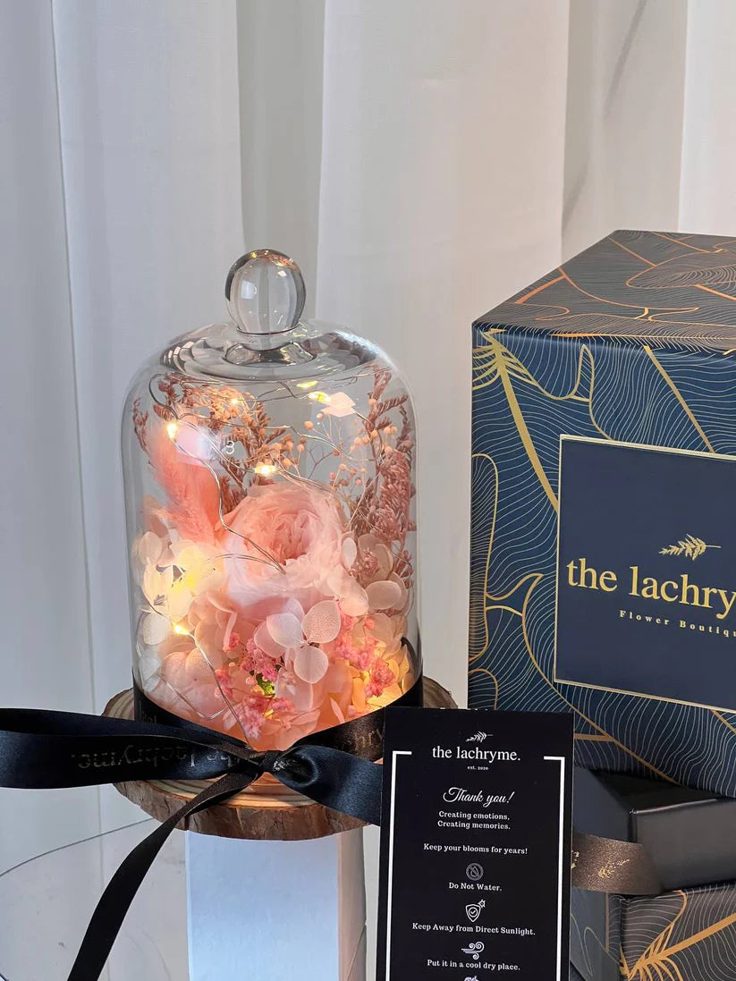 An exquisite arrangement inside a Dome composed of an Eternal Preserved Rose, Hydrangeas, Bunny Tail, Retro, and other dried flowers.